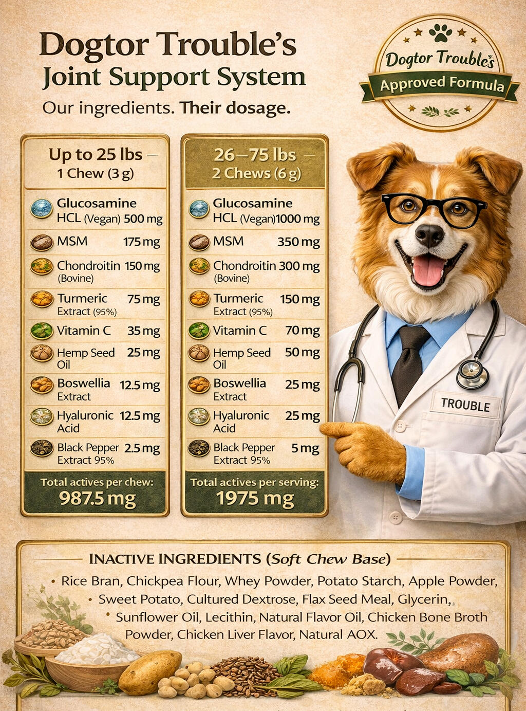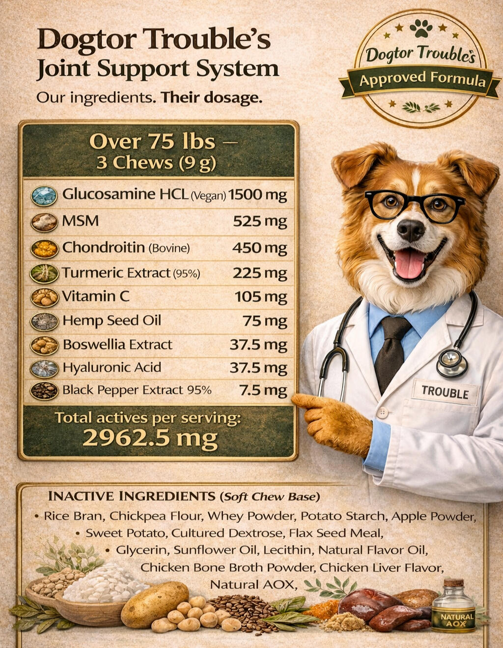 Each ingredient in Legacy Furmula™ is selected for a specific purpose — to support joint health, mobility, and comfort without unnecessary fillers or artificial additives.Below is a visual overview of how each ingredient supports the formula as a whole.